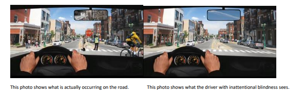 - A closer look at inattentional blindness and bike wrecks: ” Here is one of the more common examples: A driver is heading to a place that they have never been to before. They are focused on the road, but they want to make sure they take the right turn. They spot the turn and steer in that direction, hitting a cyclist. The cyclist had been there all along, the driver had even turned their head in that direction, but inattentional blindness prevented them from seeing the cyclist.”