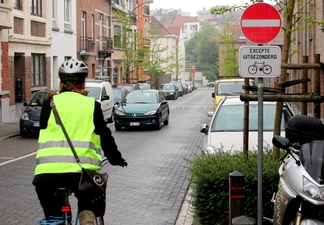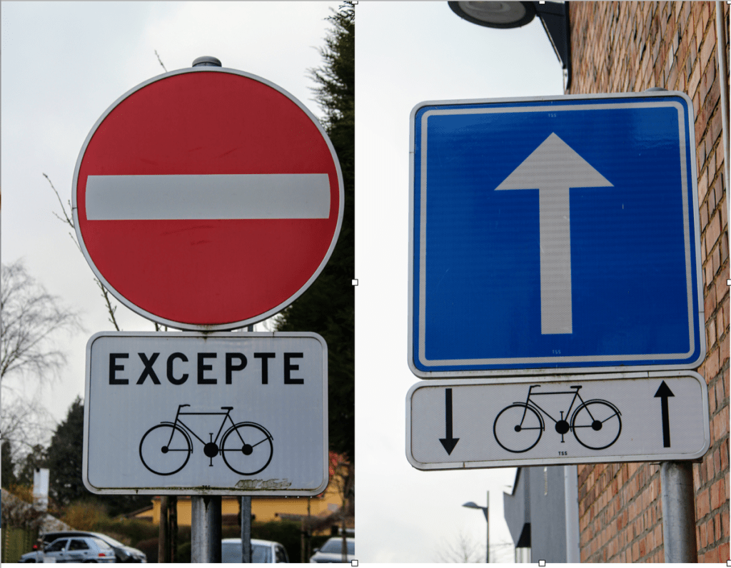 SUL (Sens Unique Limité) or BEV (Beperkt Eenrichtings Verkeer) are one-way streets open for people cycling in both directions. They are signposted with a board displaying a bicycle with two arrows going up and down under the blue square “one way” plate on one side, and an “excepté/uitgezonderd [cyclists]” board under the red “no entrance” sign on the other.